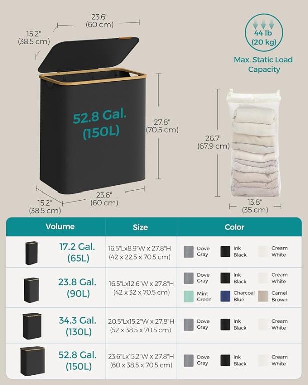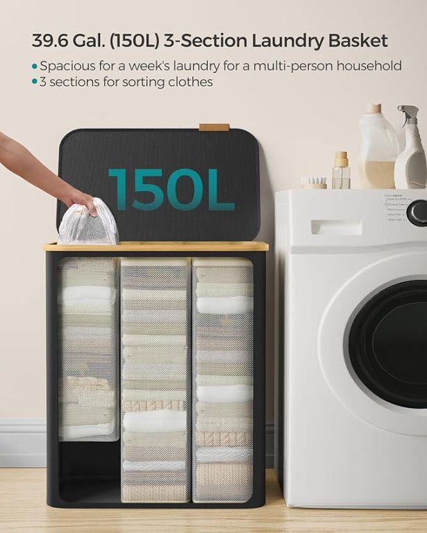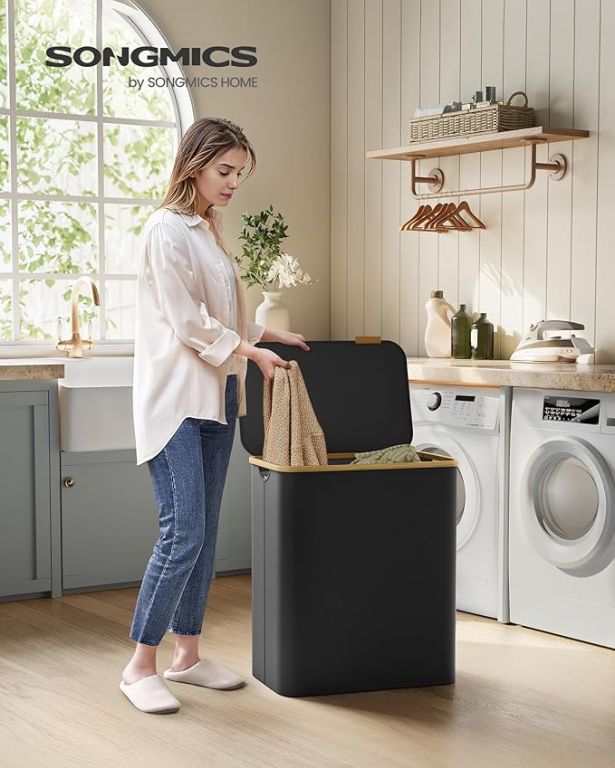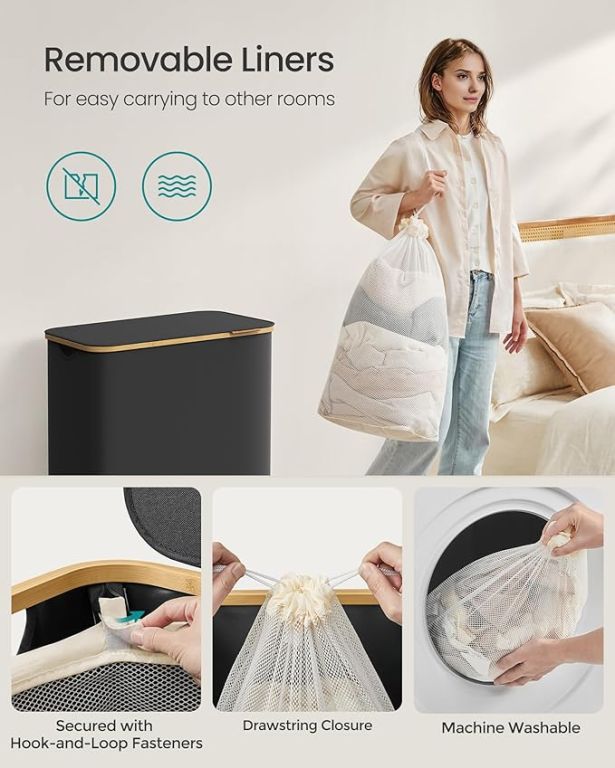 Užite si poriadok a štýl v každej domácnosti vďaka tomuto priestrannému košu na bielizeň s objemom 150 litrov. Tri oddelené priehradky umožnia ľahké triedenie bielizne celej rodiny, zatiaľ čo elegantný čierny dizajn s bambusovým rámom vynikne v každej miestnosti. Praktické veko chráni vaše súkromie a udržuje bielizeň skrytú pred zrakmi i prachom.