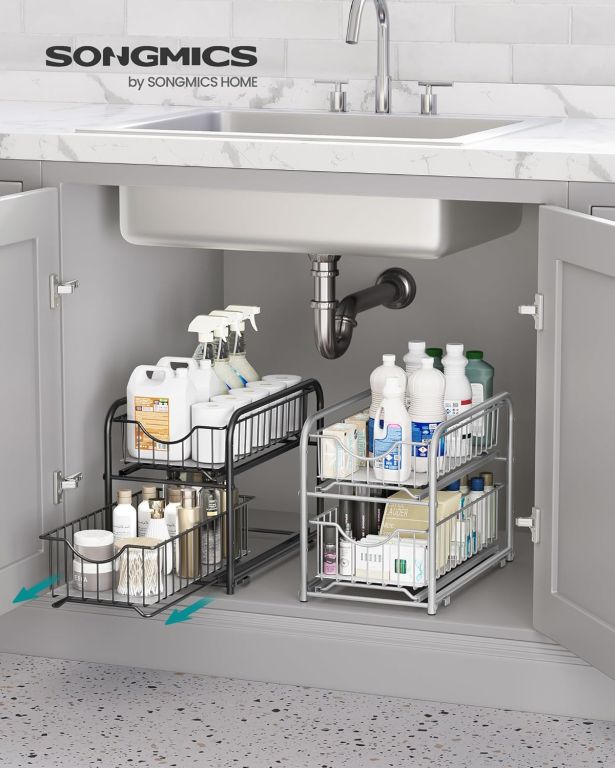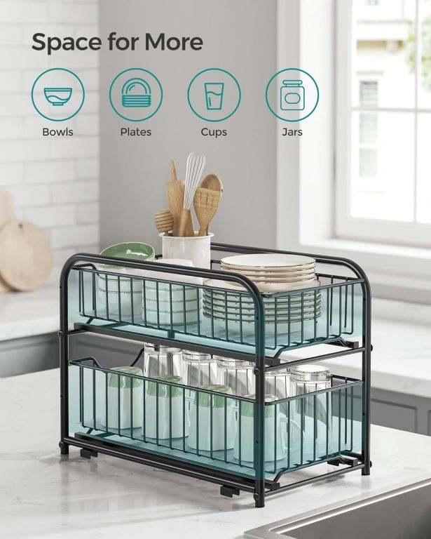 Už žiadny neporiadok pod drezom ani preplnené police! Tento 2-poschodový organizér vám pomôže využiť každý centimeter priestoru. Vďaka výsuvným košíkom máte všetko po ruke – od čistiacich prostriedkov až po kozmetiku. Elegantný čierny dizajn sa hodí do každého moderného interiéru.