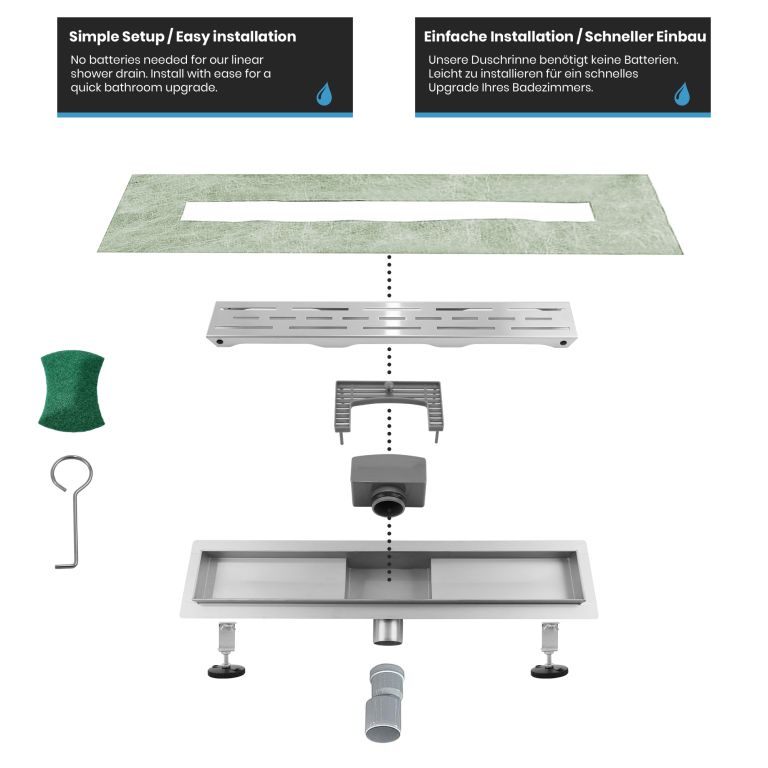 Premeňte svoju kúpeľňu na oázu štýlu a inovácie s našimi vynikajúcimi lineárnymi sprchovými odtokmi. Najvyššia kvalita nehrdzavejúcej ocele, umne leštená, v kombinácii s pieskovaným telom. Váš kúpeľňový dizajn si zaslúži niečo výnimočné, preto sú naše sprchové odtoky navrhnuté nielen tak, aby zaujali, ale aj inšpirovali svojou odolnosťou. Vďaka zapustenému povrchovému materiálu garantujeme produkt, ktorý vydrží skúšku času. Inštalácia je rýchla, nekomplikovaná a nevyžaduje batérie. Mysleli sme na všetko, aby ste sa mohli bez obáv sústrediť na to, čo je dôležité. Vylepšite formu a funkciu svojho sprchového kúta s našim elegantným a odolným lineárnym sprchovým odtokom, ktorý dodá vašej každodennej rutine sofistikovanosť.