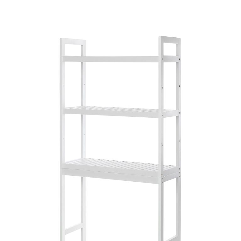 Vnesiete sviežosť a poriadok do vašej kúpeľne. Táto trojstupňová bambusová polička v elegantnej bielej farbe ponúka dostatok priestoru pre všetky vaše toaletné potreby, bez toho aby zaberala príliš veľa miesta. Nastaviteľné police sa prispôsobia vašim potrebám, či už ukladáte malé kozmetické výrobky alebo vysoké fľaše šampónov.