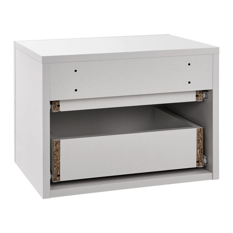 Stolík je vyrobený z kvalitnej drevotriesky s odolnou povrchovou úpravou, ktorá zaisťuje jednoduchú údržbu. Jednoduchá montáž na stenu šetrí miesto a umožňuje ľahký prístup k upratovaniu pod stolíkom. Dve zásuvky poskytujú dostatok úložného priestoru na každodenné potreby.