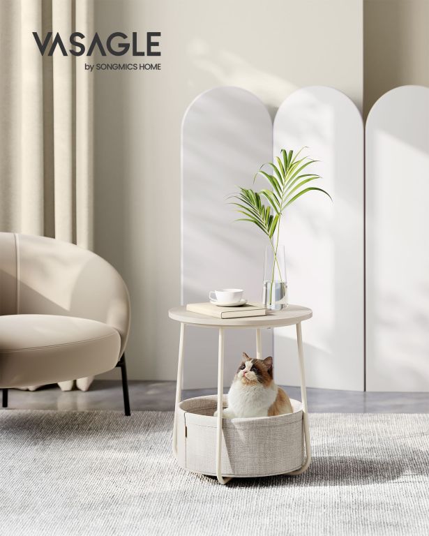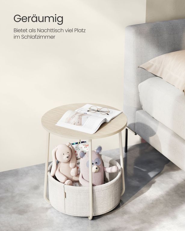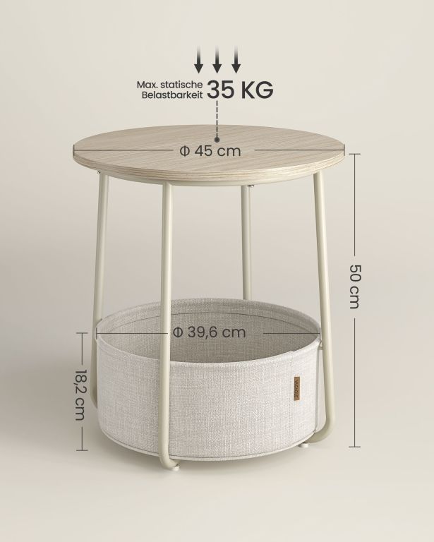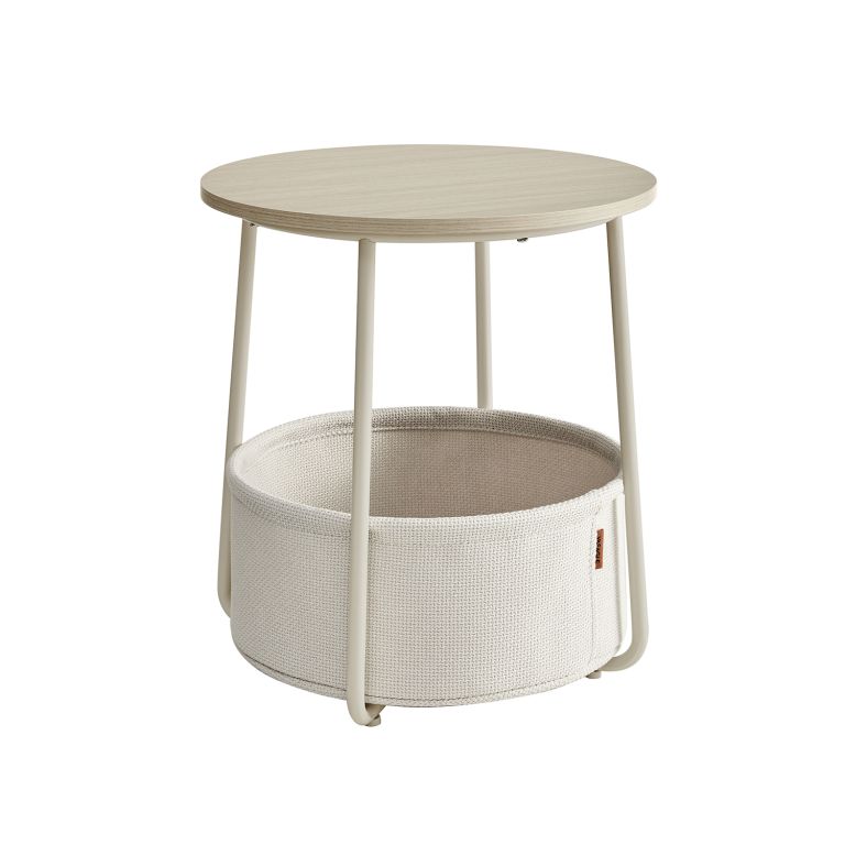 Vneste do svojho domova sviežosť a poriadok s týmto kompaktným okrúhlym stolíkom. Praktický látkový kôš ponúka úložný priestor na všetko potrebné bez toho, aby zaberal miesto. Krémovo biely odtieň sa hodí do každého štýlu interiéru.