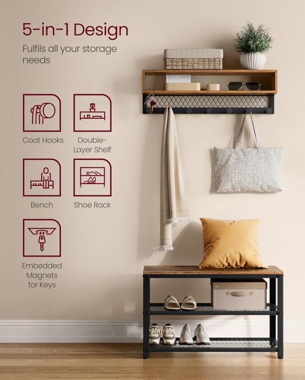 Vďaka lavici s nosnosťou až 136 kg môžete pohodlne sedieť pri obúvaní topánok, zatiaľ čo 7 kovových háčikov a dvojposchodový stojan na topánky poskytujú priestor na kabáty, tašky a topánky. Magnetické držiaky na kľúče a nastaviteľné nožičky zaručujú stabilitu a funkčnosť. Ideálna voľba pre každého, kto hľadá kombináciu elegancie, praktickosti a odolnosti.