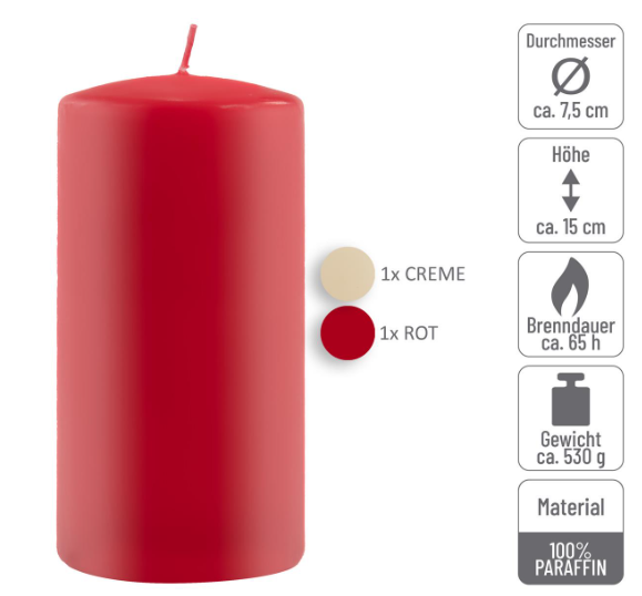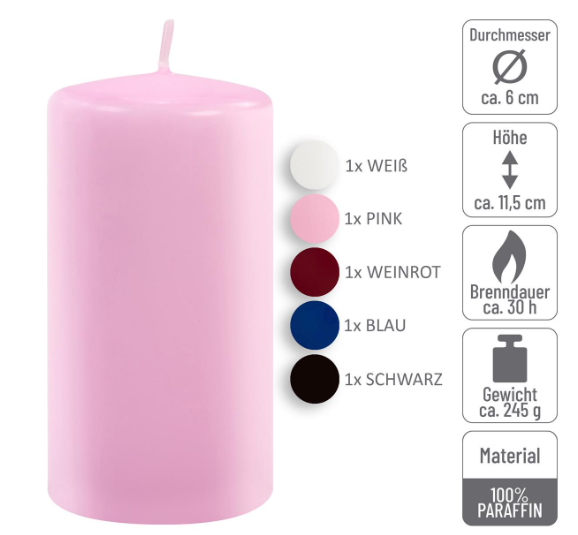 Súprava váži celkom 5 kg a obsahuje až 17 sviečok rôznych veľkostí a farieb. Každá sviečka je vyrobená z vysoko kvalitného parafínu, je farebná a potiahnutá voskom pre dlhšiu životnosť. Vďaka svojmu stabilnému tvaru je vhodná do svietnikov aj na samostatné použitie.
