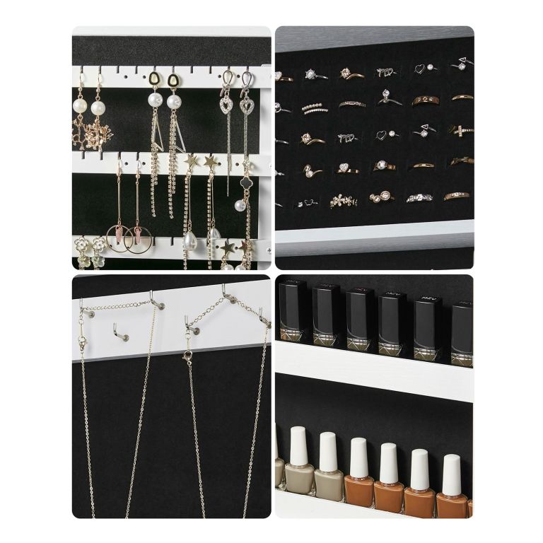 Objavte šperkovnicu, ktorá spája praktickosť so štýlom. Elegantný biely dizajn s veľkým zrkadlom dodá vašej spálni či predsieni šmrnc a zároveň poskytne dokonalý prehľad o vašich šperkoch. Všetky poklady budete mať vždy po ruke a vďaka uzamykaniu zostanú v bezpečí. Ideálne pre každú ženu, ktorá si chce užívať krásu aj poriadok.