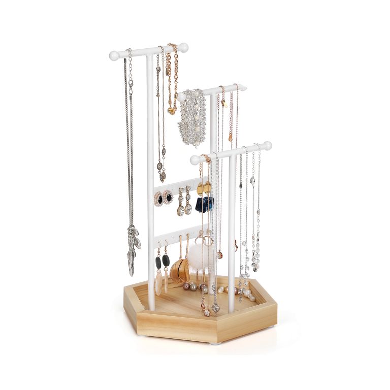 Hexagonálna drevená základňa zaisťuje stabilitu, zatiaľ čo tri T-tyče v rôznych výškach umožňujú zavesenie rôznych druhov šperkov. 16 otvorov poskytuje miesto pre náušnice a prstene. Jednoduchá montáž vďaka skrutkám a gumovým tesneniam.