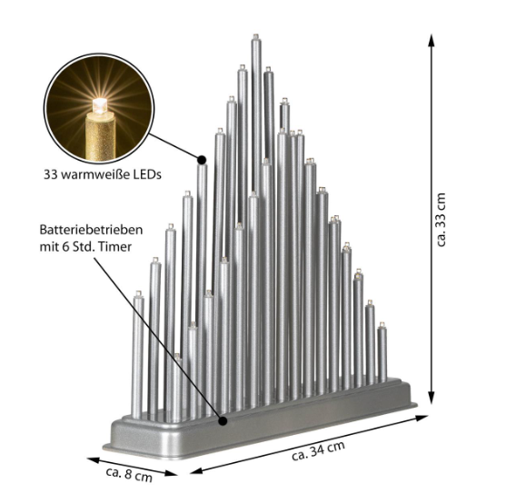 Dizajnový a elegantne riešený svietnik s 33 LED diódami vykúzli romantickú atmosféru nielen počas Vianoc. Vďaka napájaniu AA batériami môžete svietnik umiestniť kamkoľvek si spomeniete, nie ste limitovaný rozmiestnením zásuviek vo Vašom byte.